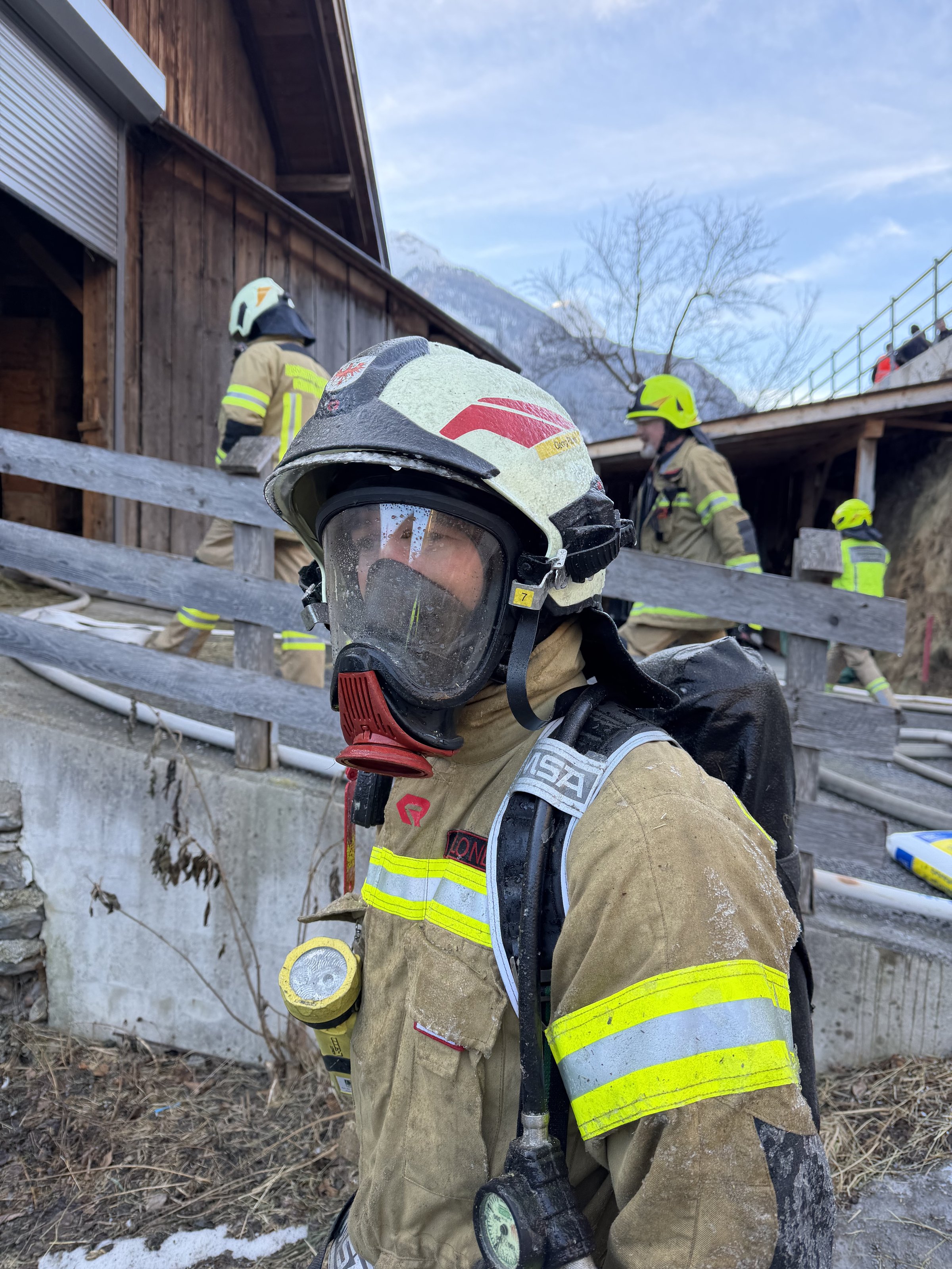 Parallel wurde ein Löschangriff auch unter schwerem Atemschutz vorgenommen. Da sich im Inneren die Löscharbeiten schwierig gestaltete, wurde die Feuerwehr Landeck alarmiert. Deren Aufgaben waren in erster Linie die Atemschutzsammelstelle einzurichten und die Sicherstellung genügender Reserveflaschen. Des Weiteren wurde ein RLF in Prutz für die Flächenabdeckung positioniert.
