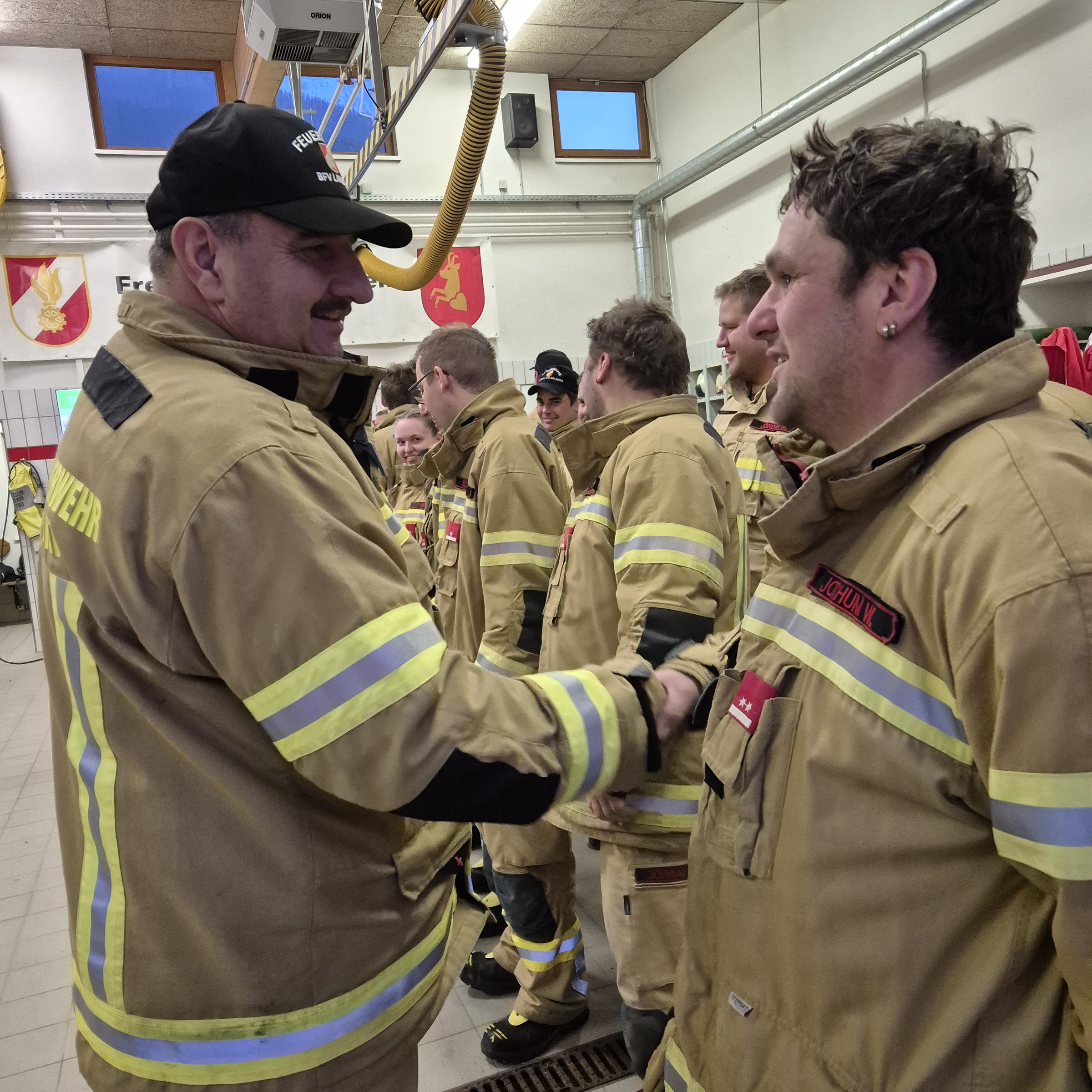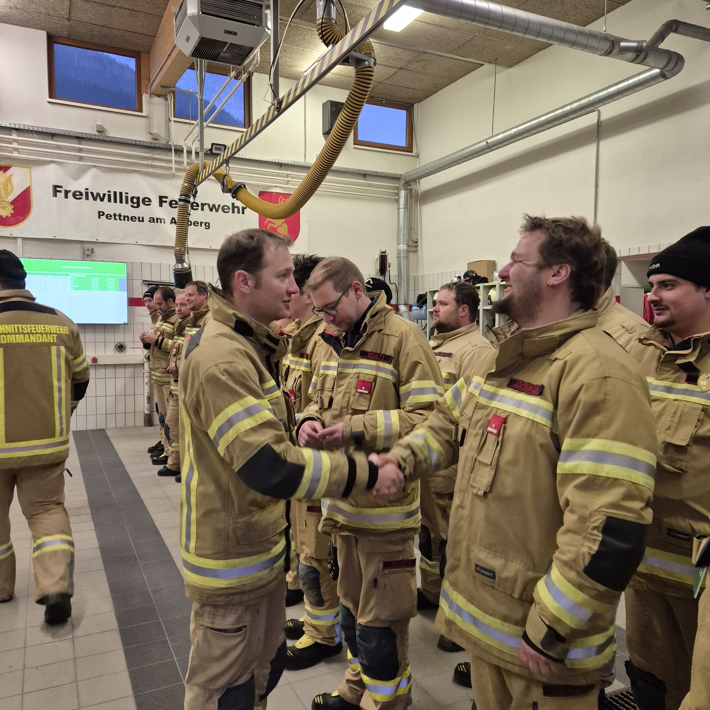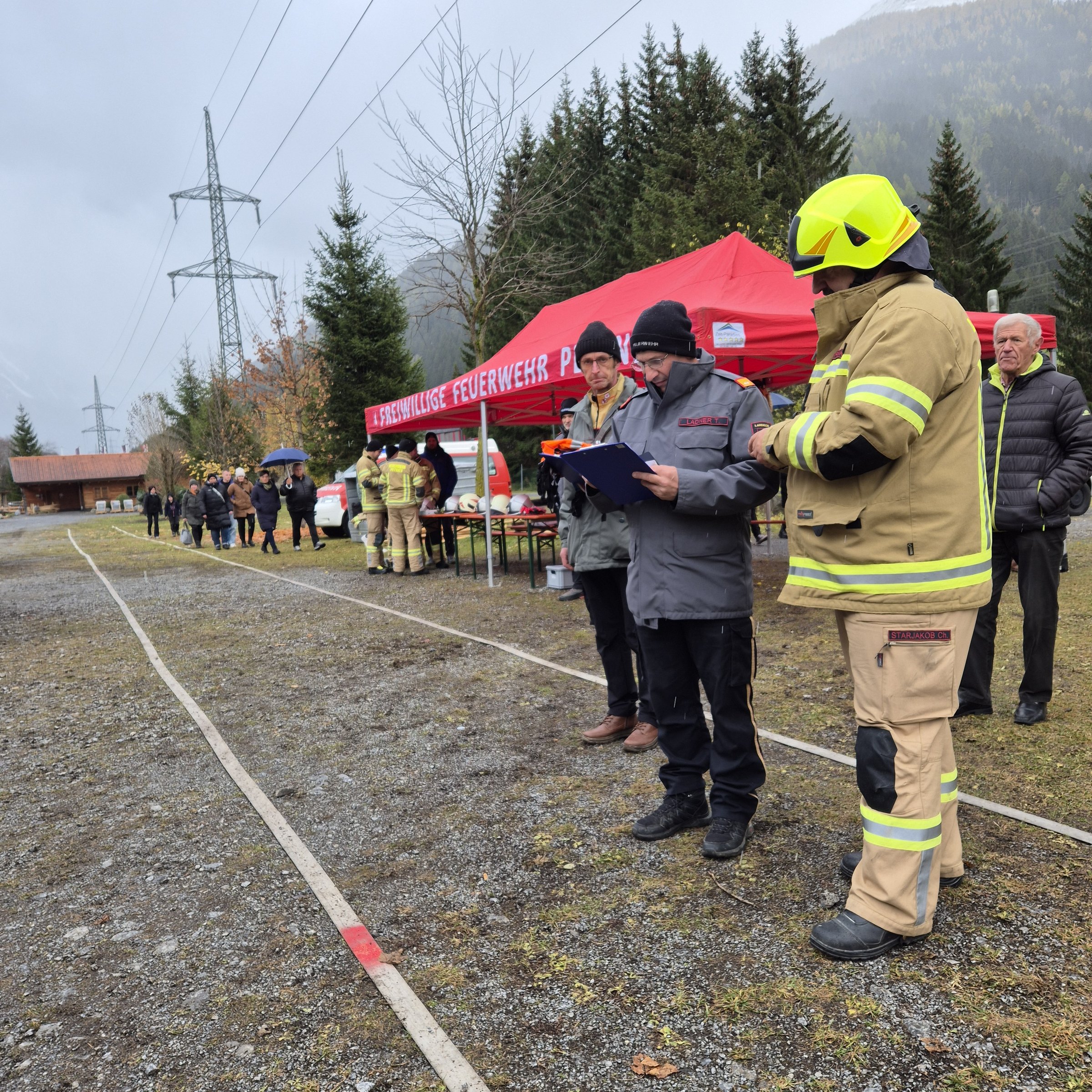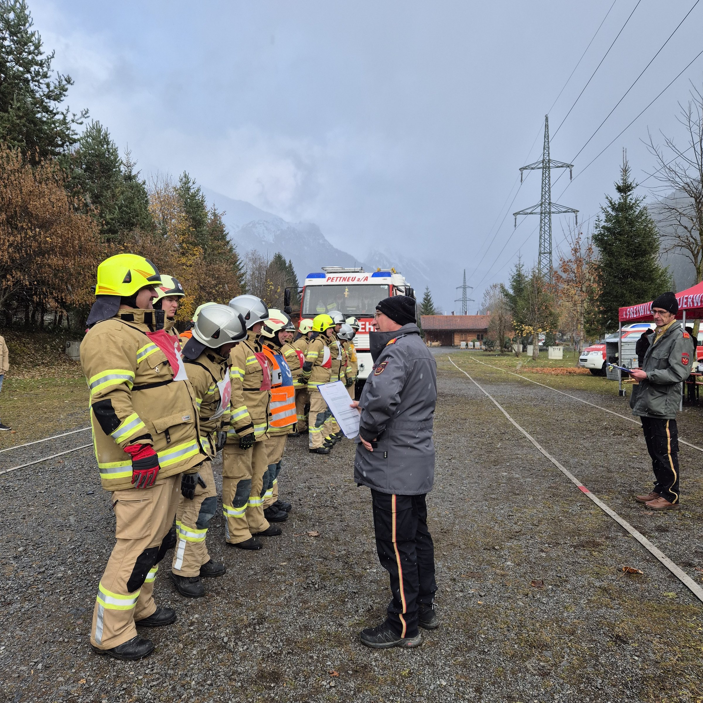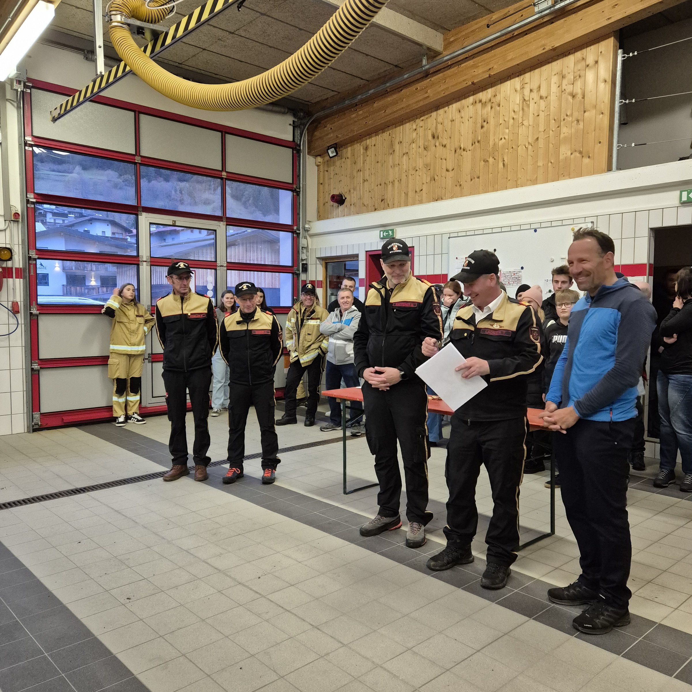 Anschließend wurde die Schlussveranstaltung in die Feuerwehrhalle Pettneu verlegt. Dort wurde von Hauptbewerter Bezirkskommandant-Stellvertreter Thomas Ladner die Abzeichen in Silber und Gold gemeinsam mit Bezirksfeuerwehrinspektor Martin Raffeiner und Bürgermeister Partik Wolf verliehen. In deren vorangegangen Ansprachen wurden die Feuerwehrmitglieder hoch gelobt und das Bewerbswesen nochmals hervorgehoben. Auch Kommandant Christian Starjakob, welcher in seiner kurzen Ansprache seine Mannschaft lobte, und sein Stellvertreter Johannes Scalet, befanden sich auch unter den Bewerbsteilnehmern.